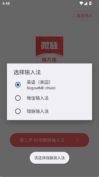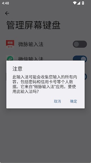 2、启用微脉输入法后,点击确认。