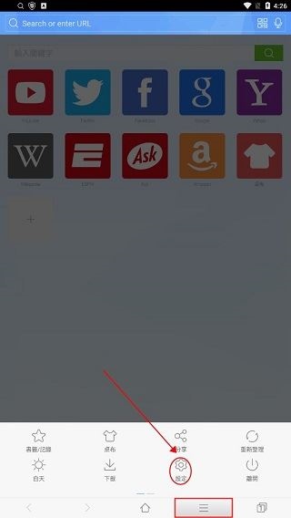1、进入手机浏览器,点击底栏【菜单】并滑动选项找到【设置】