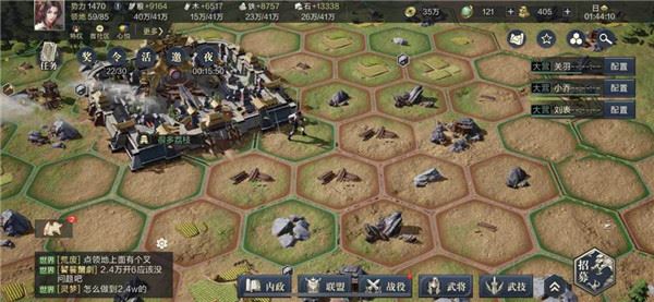 4、集市升级:游戏中资源分布不均,升级主城、太尉府、裨将府和领兵府是优先事项,平时可以按照任务顺序推进,除非遇到紧急需求。